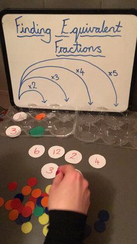 • Place counters in the first two sections to build your first fractions (in this case 1/3). Children then place the correct number discs on top.