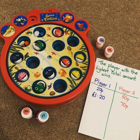 🎣 Race to Zero – each player starts with £5.00 and as they fish they must subtract the amount on the bottom of each fish. The first player to get to zero (or as close as possible once all the fish have been removed) is the winner.