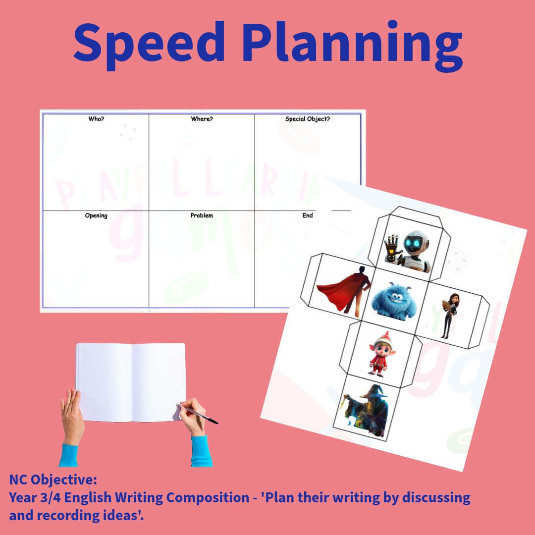 Aim of the Game: The objective of Speed Planning is to rapidly and creatively plan out a story using prompts determined by rolling dice or picking picture cards. Players outline their story within set time limits, creating a unique narrative that they can later expand into a full-fledged tale.